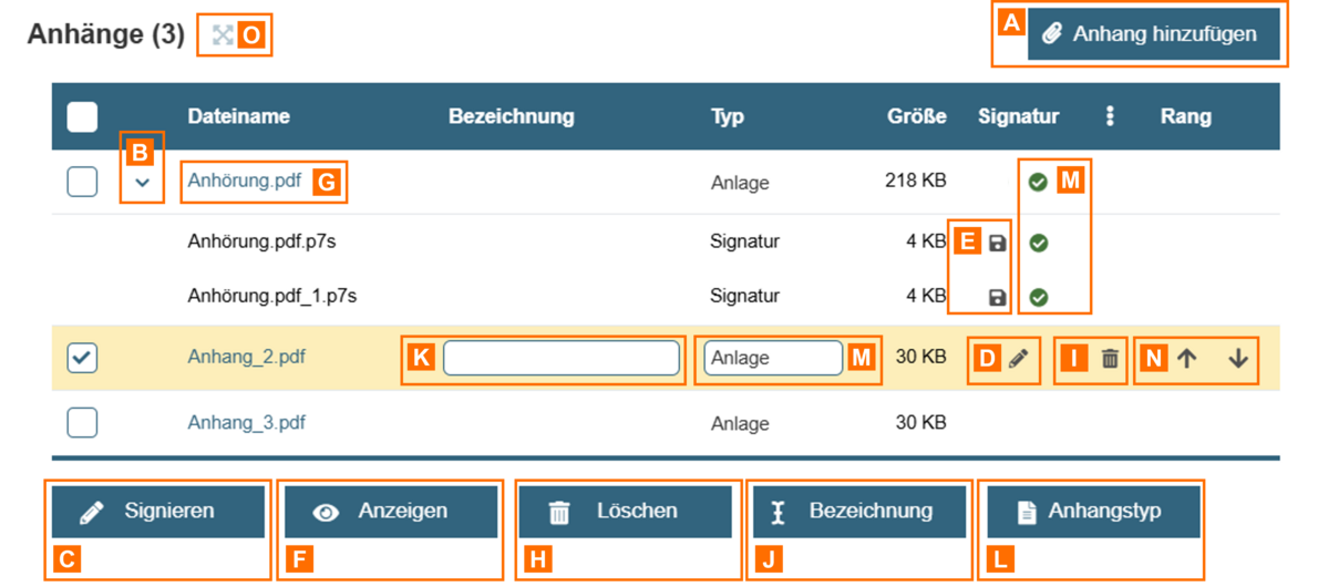 | Signieren C, D | Mit dieser Schaltfläche können Anhänge nach dem Hochladen signiert werden. Es können mehrere Anhänge gleichzeitig ausgewählt und signiert werden. Anhänge können außerdem mehrfach signiert werden. Über das Signieren-Icon in der Tabellenzeile D können einzelne Anhänge ebenfalls signiert werden. Nach dem Signieren wird automatisch eine Signaturprüfung des Anhangs durchgeführt und das Ergebnis in der Spalte Signatur D angezeigt. Beim Klicken auf die Schaltfläche wird das Signatur-Prüfprotokoll dieses Anhangs angezeigt.