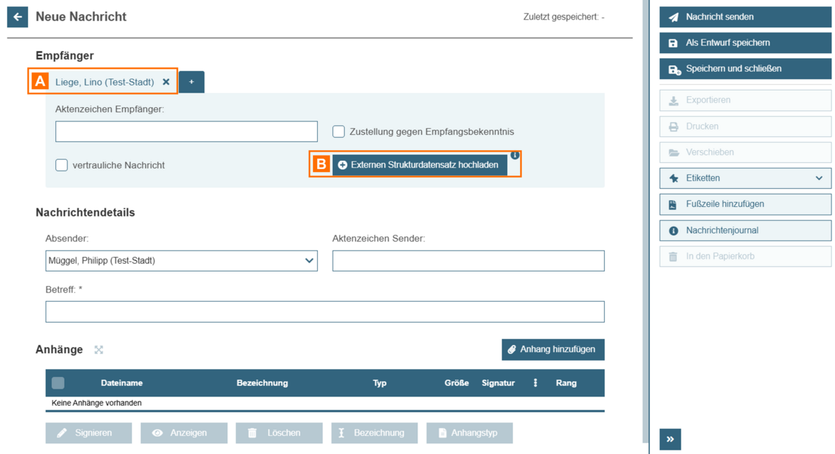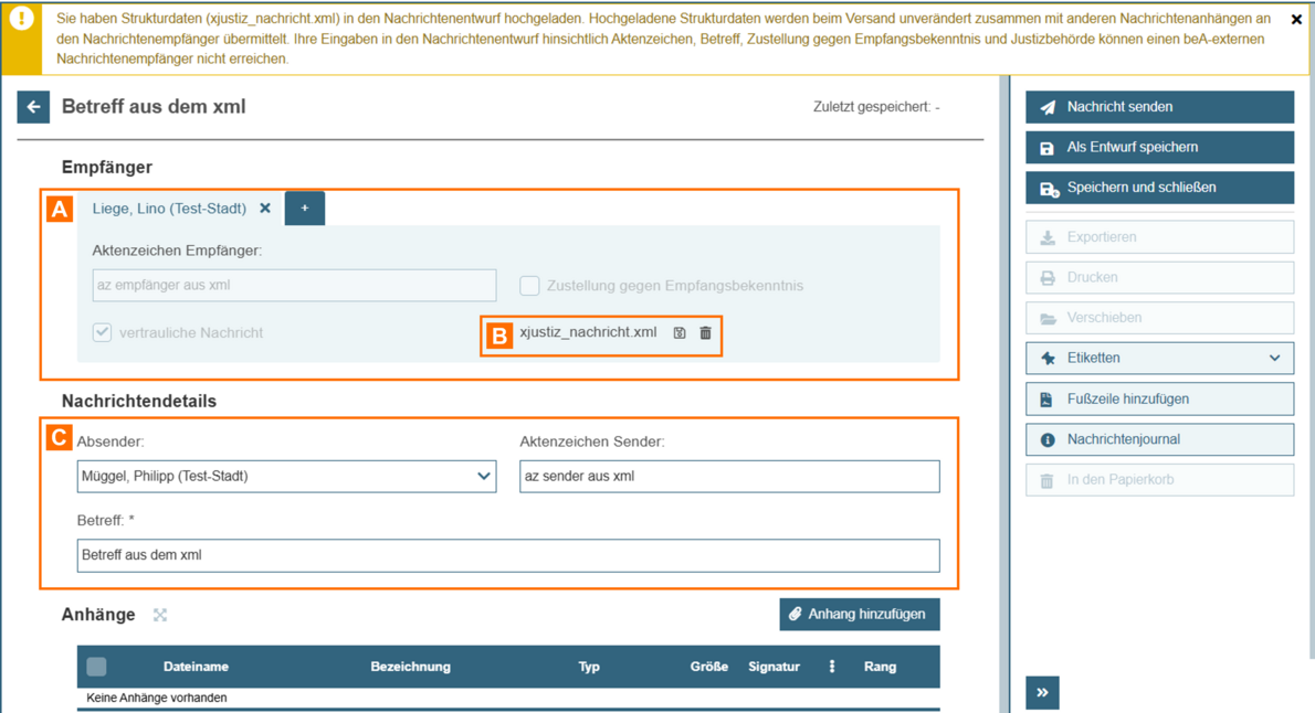 - Hochgeladene Strukturdaten werden beim Versand unverändert zusammen mit anderen Nachrichtenanhängen an den jeweiligen Nachrichtenempfänger übermittelt. In diesem Fall generiert die beA-Anwendung für den jeweiligen Empfänger keinen eigenen Strukturdatensatz, d.h. Ihre Eingaben in den Nachrichtenentwurf hinsichtlich Aktenzeichen, Betreff, und Zustellung gegen Empfangsbekenntnis können einen beA-externen Nachrichtenempfänger nicht erreichen.