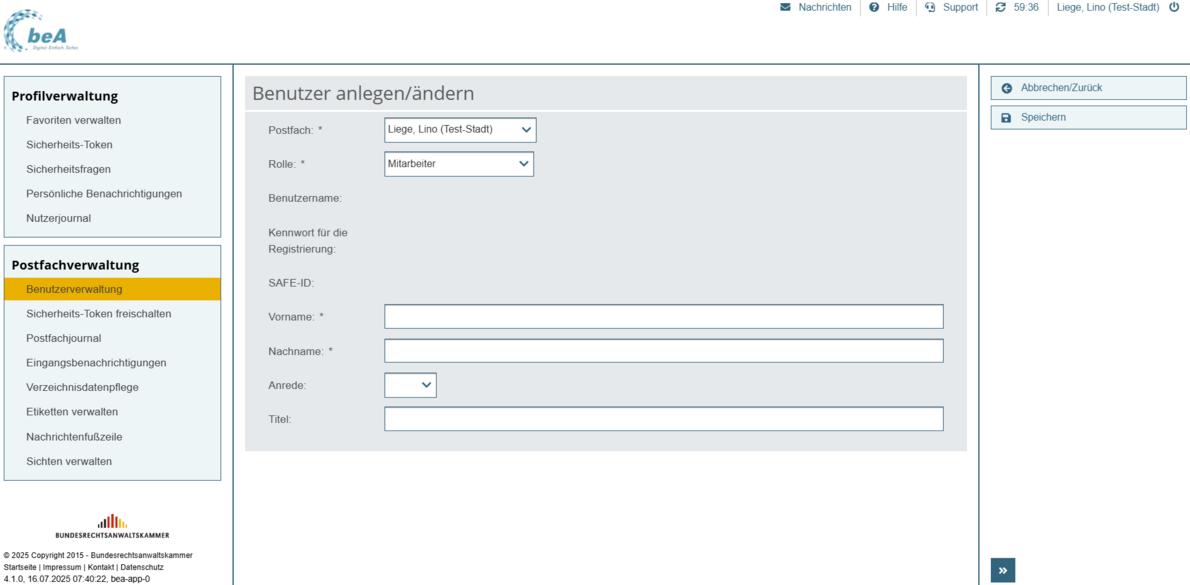 - der Änderung bestimmter Benutzerdaten (Vorname, Nachname, Anrede, Titel) eines bereits vorhandenen Mitarbeiters, der Ihrem Postfach oder einem Postfach zugeordnet ist, auf welchem Sie das Recht „Mitarbeiter verwalten“ besitzen.