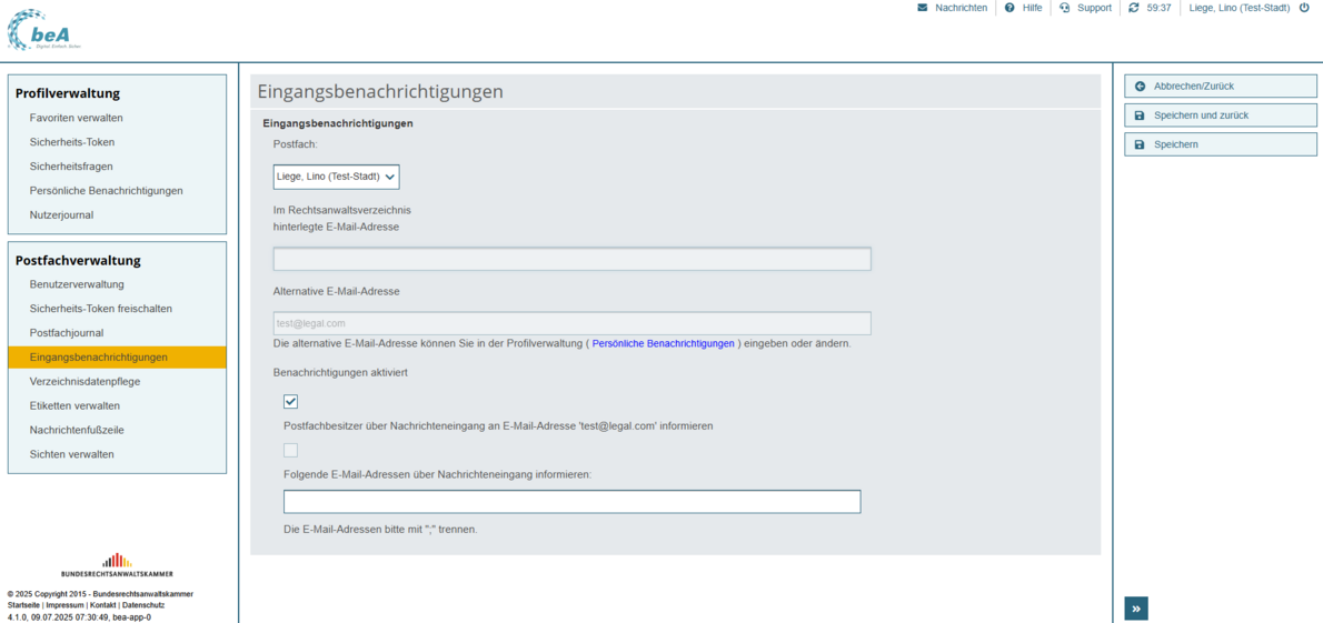 | Benachrichtigungen aktivieren/aktiviert | Mit dem ersten Markierungsfeld können Sie festlegen, ob Ihnen Eingangsbenachrichtigungen an eine E-Mail-Adresse (E-Mail-Adresse im Rechtsanwaltsverzeichnis oder alternative E-Mail-Adresse) zugeschickt werden. Wenn Sie das Markierungsfeld nicht ausgewählt haben oder wenn Sie überhaupt keine E-Mail-Adresse hinterlegt haben, wird folgender Text neben dem Markierungsfeld angezeigt: „Es ist keine E-Mail-Adresse für Benachrichtigungen hinterlegt“. Mit dem zweiten Markierungsfeld können Sie festlegen, ob Eingangsbenachrichtigungen an weitere E-Mail-Adressen versandt werden. Dieses Markierungsfeld ist nur aktiv, wenn eine weitere E-Mail-Adresse für Eingangsbenachrichtigungen im nachfolgenden Eingabefeld erfasst wurde. |