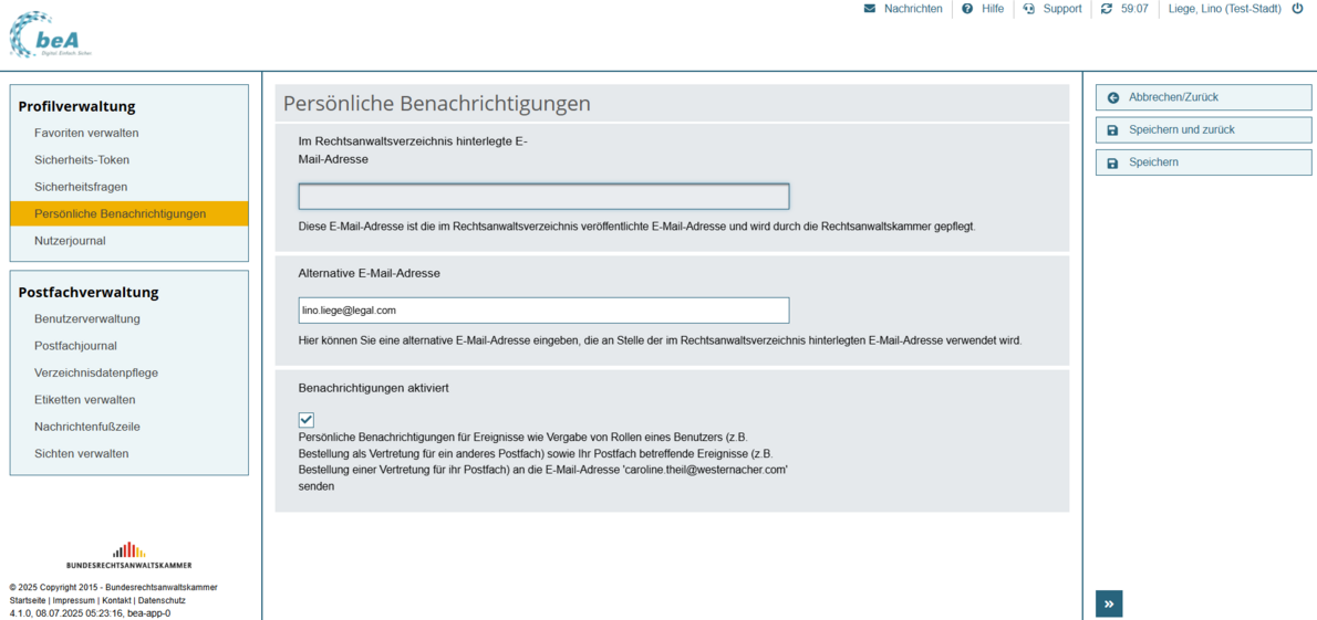 Für die Verwaltung von Benachrichtigungen über den Eingang einer Nachricht im beA-Postfach, siehe Eingangsbenachrichtigungen.