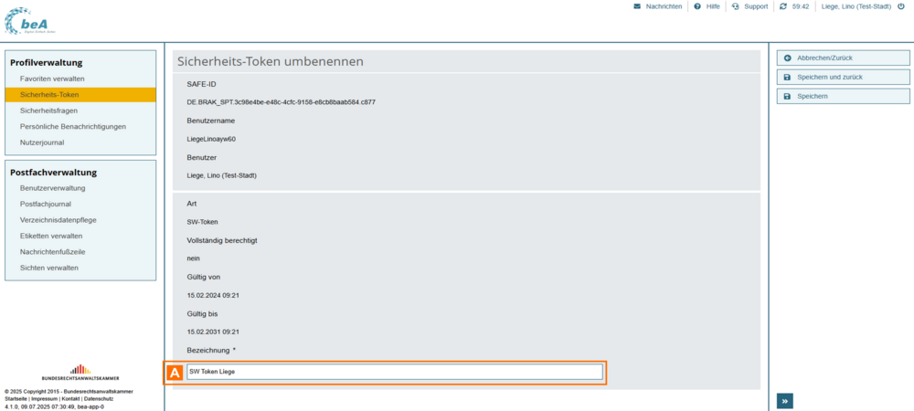 Im nachfolgenden Dialog können Sie die Bezeichnung A des ausgewählten Sicherheits-Tokens ändern und speichern.