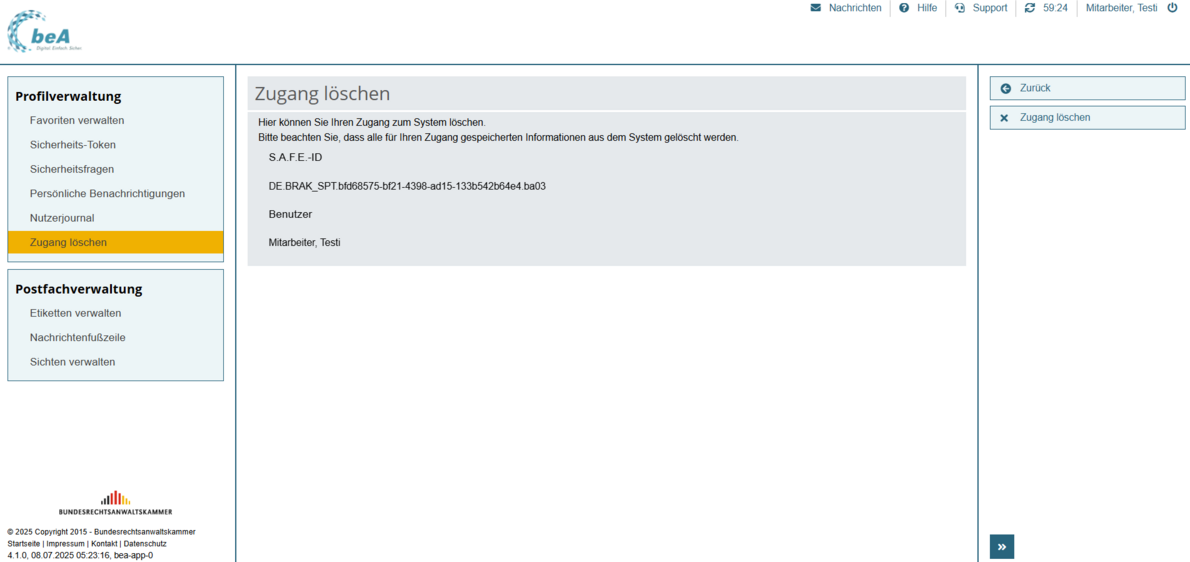 Zugang löschen | Mit dieser Schaltfläche können Sie Ihren Zugang zum beA nach Bestätigung einer Sicherheitsabfrage löschen. Bitte beachten Sie, dass alle für Ihren Zugang gespeicherten Informationen aus dem System gelöscht werden. |