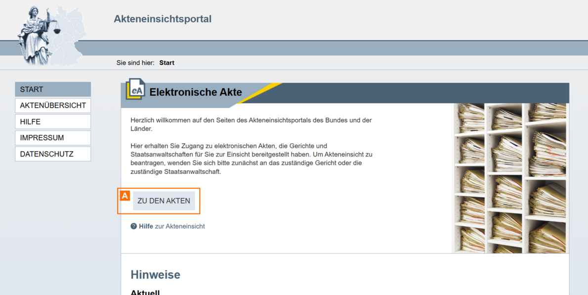 Das Akteneinsichtsportal ist über einen Link im beA-Portal A oder direkt über die Internetseite https://www.akteneinsichtsportal.de/ erreichbar.
