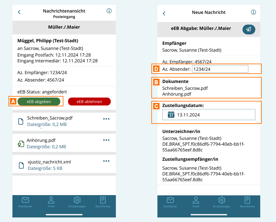 Im Posteingang wird angezeigt, ob ein elektronisches Empfangsbekenntnis (eEB) angefordert oder bereits abgegeben/abgelehnt wurde.