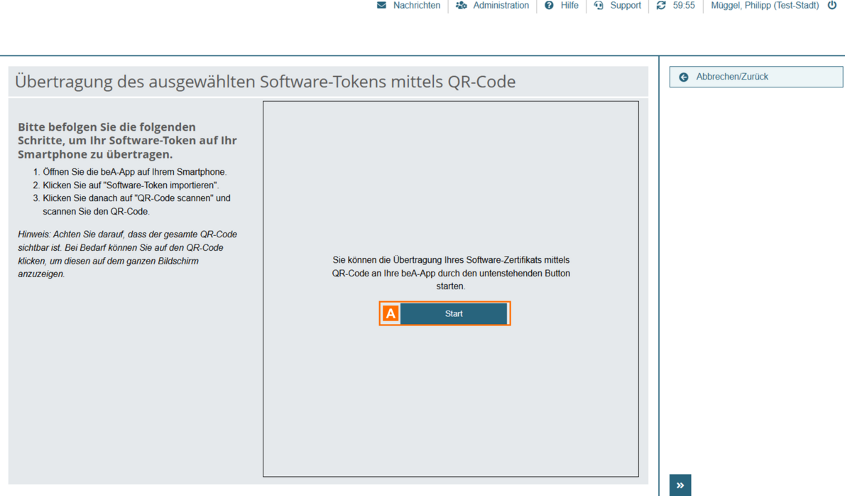 Es öffnet sich eine Seite, auf der Sie einen QR-Code für Ihr Software-Token erzeugen können. Klicken Sie auf "Start" A, um den QR-Code anzuzeigen.