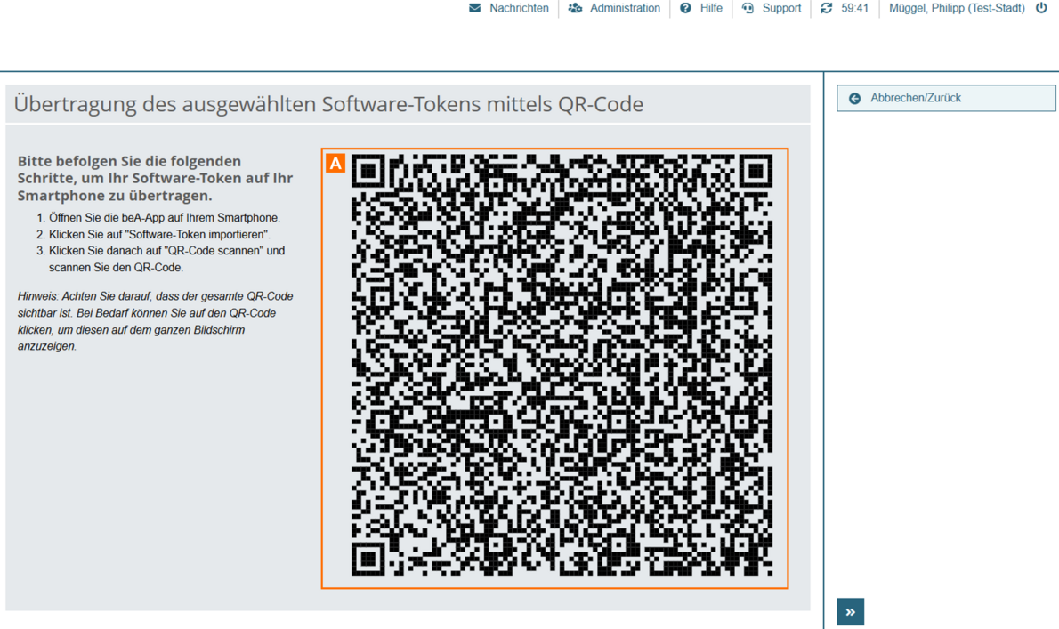 Um den QR-Code mit Ihrer beA-App vollständig scannen zu können, muss der gesamte QR-Code A auf dem Bildschirm sichtbar sein.