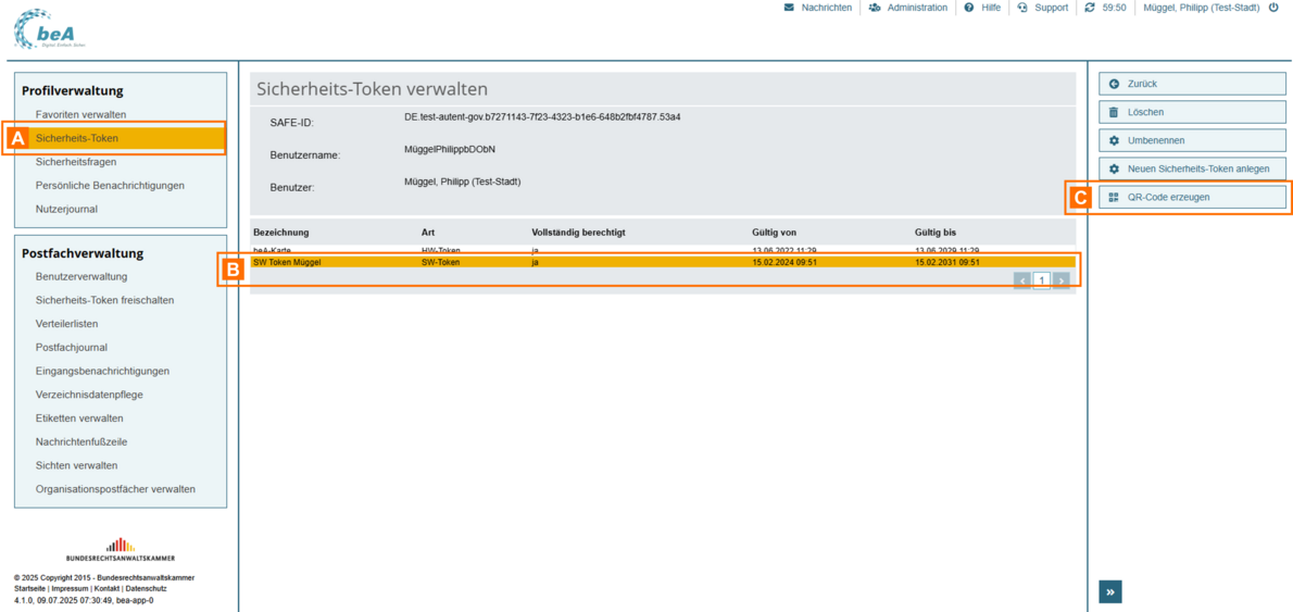 Wählen Sie ein dort hinterlegtes Software-Token B aus und klicken Sie auf die Schaltfläche "QR-Code erzeugen" C.