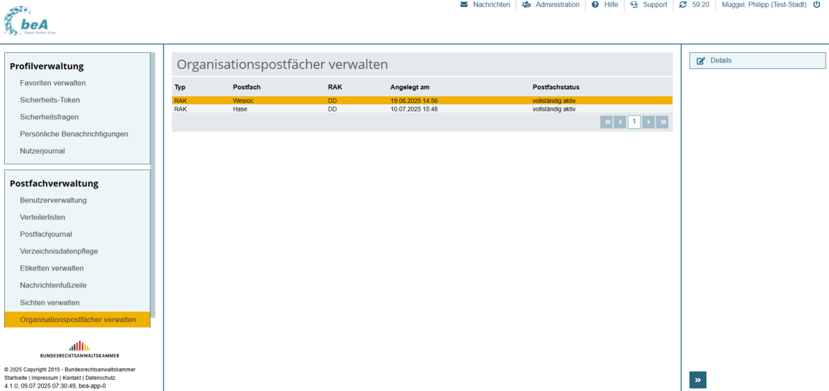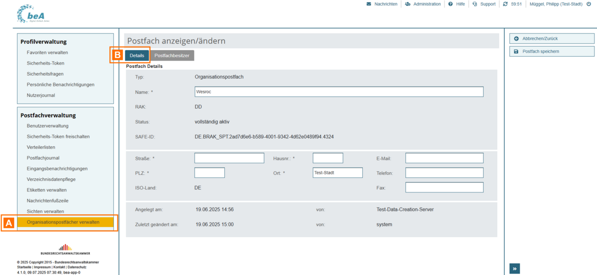 - Detail: Daten können nur mit dem Recht "23 - Organisationspostfachdaten pflegen" bearbeitet werden.